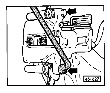 Remove brake caliper housing (hold guide pin with open end wrench while loosening bolts)