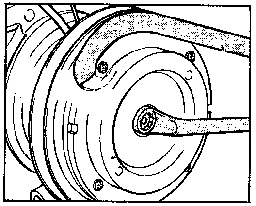 -Hold A/C compressor clutch with tool and loosen and remove nut.