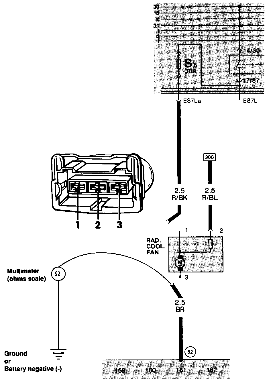 Voltage: If the test light or multimeter indicates voltage, then there is potential for current flow between the known voltage source and ground at the test point. The ground side of the circuit, between terminal 3 of the fan connector and battery negative (-), is OK.