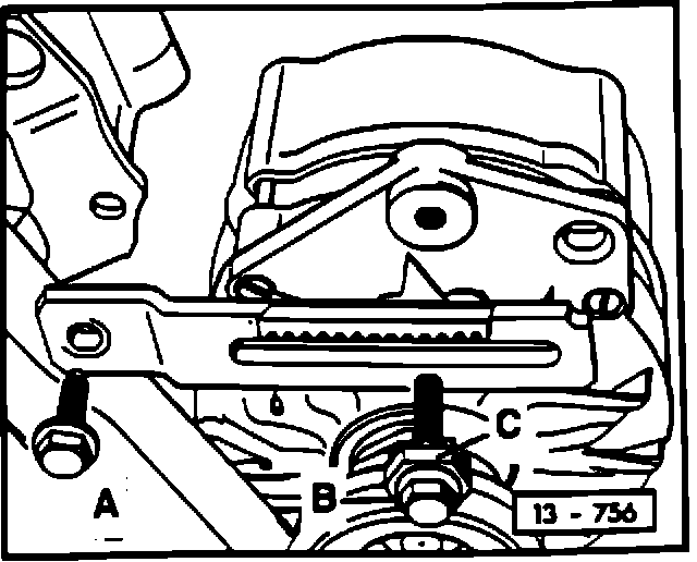 Alternator V-belt tension can be adjusted by using a torque wrench and crowfoot in combination with the toothed rack, and tensioning gear (C).