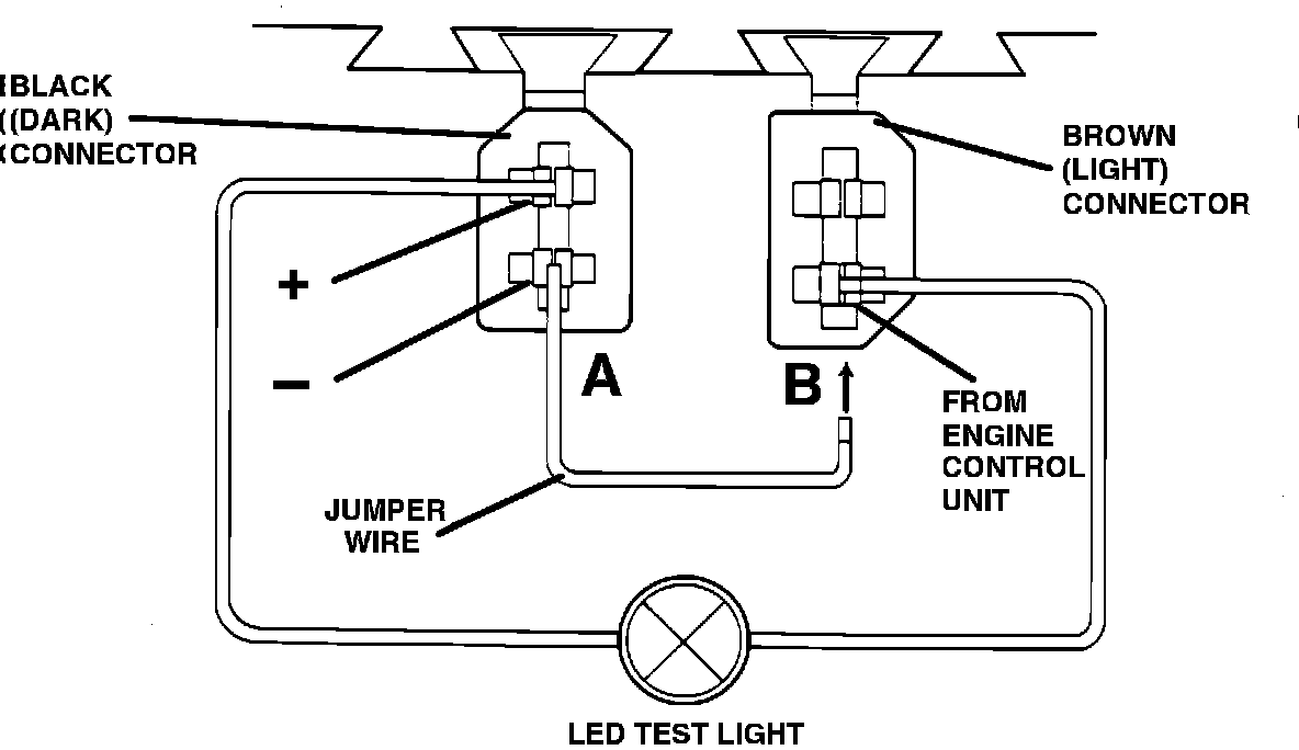 If either control unit will not enter output check mode, check continuity of wires between diagnostic connectors and control unit. Also check for power at top terminal of black diagnostic connector (should have battery power), and check control units and wire at bottom terminal of black diagnostic connector for good ground connections. Repair as necessary. If no wiring or power supply problems are found, and control units still won't enter output check mode, then one or both control units are faulty.