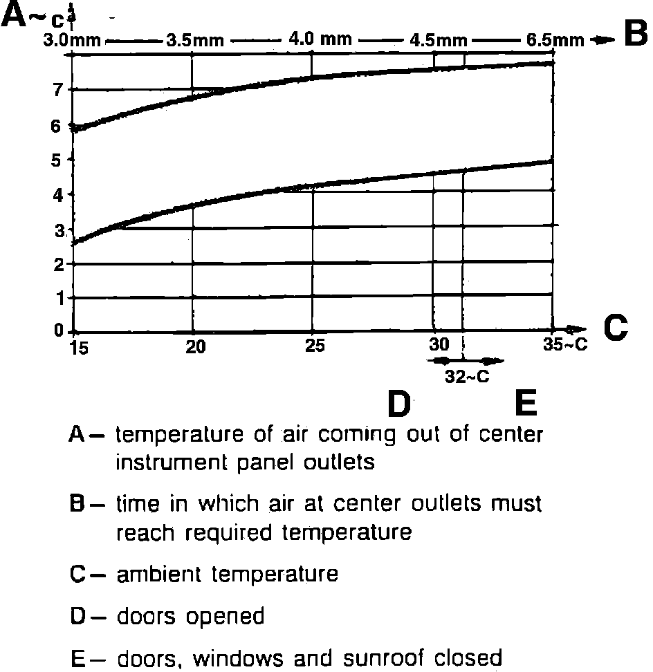 With engine running, set mode to AUTO and temperature to LO, set blower speed to HI and open all instrument panel outlets. Ensure compressor is driven or switches On, fresh air blower runs, radiator cooling fan runs, recirculation/fresh air flap goes into recirculation position after one minute, water valve for heating is closed, evaporator, heater and connecting piece between heater and evaporator does not draw any secondary air, air comes out of instrument panel outlets and temperature flap is in cooling position. Temperature of air coming out of center instrument panel outlets must be within tolerance on chart in Fig. 1, and depends on ambient temperature and cool down period.