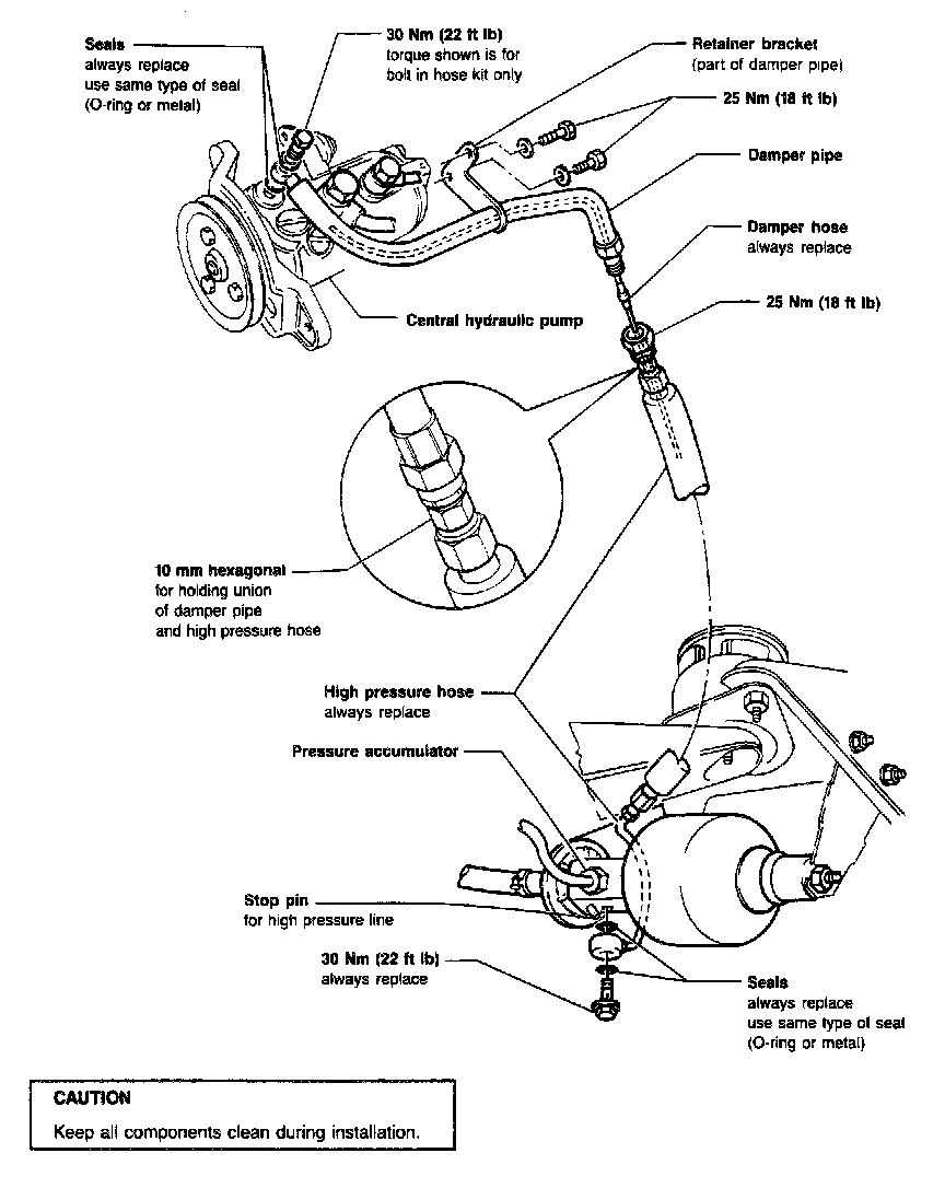 CAUTION: DO NOT install 0-ring seals in place of metal seals or vice versa. DO NOT kink high pressure hose when installing.