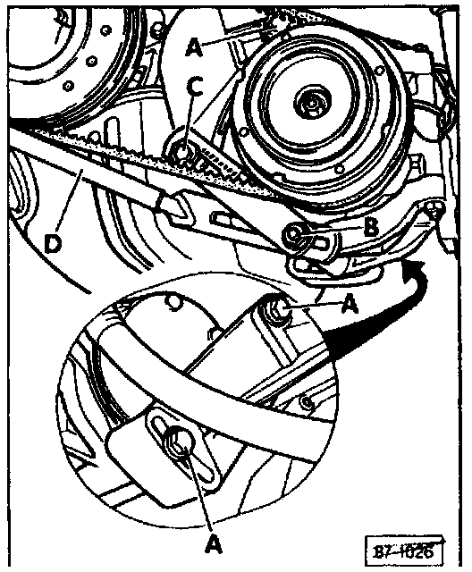 7. Tighten bolt between alternator tension bracket and tension bracket D.