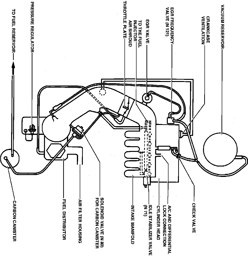 The function of the exhaust gas recirculation (EGR) system is monitored by the injection control unit. While the EGR valve is operated by vacuum, the vacuum supply is controlled by the EGR frequency valve, which is controlled by the ECU. This allows for a more precise control of when exhaust gasses are introduced into the combustion process, thus minimizing the affect on driveability and performance.