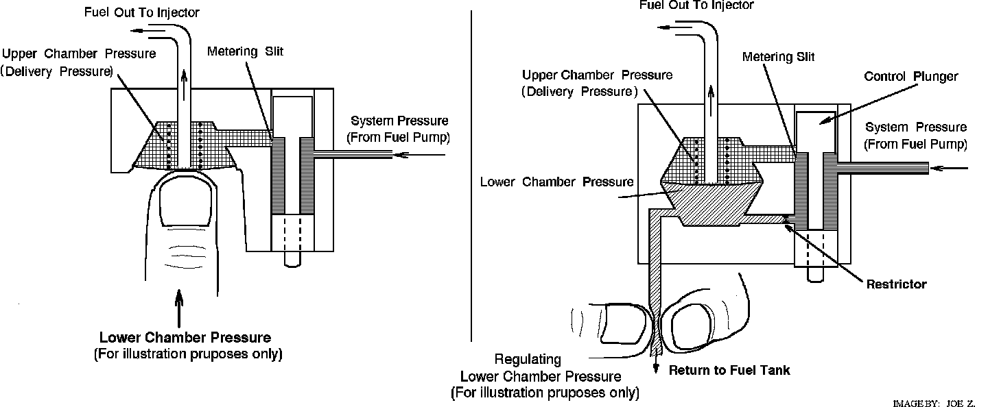The total pressure in the upper chamber (fuel delivery pressure + pressure due to spring) must exceed the total pressure exerted form the lower chamber side of the diaphragm (control pressure) before fuel can exit through the differential pressure valve and go to the injector (something like pressing your finger up against the differential pressure valve, if you could do so, see illustration). If the control pressure is low, then the delivery pressure is correspondingly low compared to the system pressure. This means that the pressure drop at the metering slit is large and a large quantity of fuel will flow through the metering slit (for a given position of the control plunger). If the control pressure is increased, the delivery pressure increases, and the pressure drop across the metering slit decreases, reducing the quantity of fuel that flows through the metering slit (for the same given position of the control plunger). If the control pressure is allowed to increase to the same as the system pressure, the pressure drop is reduced to nearly zero (delivery pressure = system pressure - spring pressure) and very little fuel will enter the upper chamber through the metering slit.