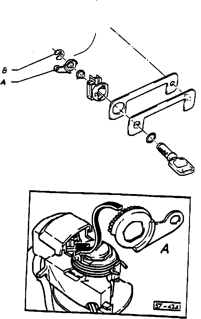 Operating lever "A" of heated lock cylinder broken, may have been damaged during circlip "B" installation.