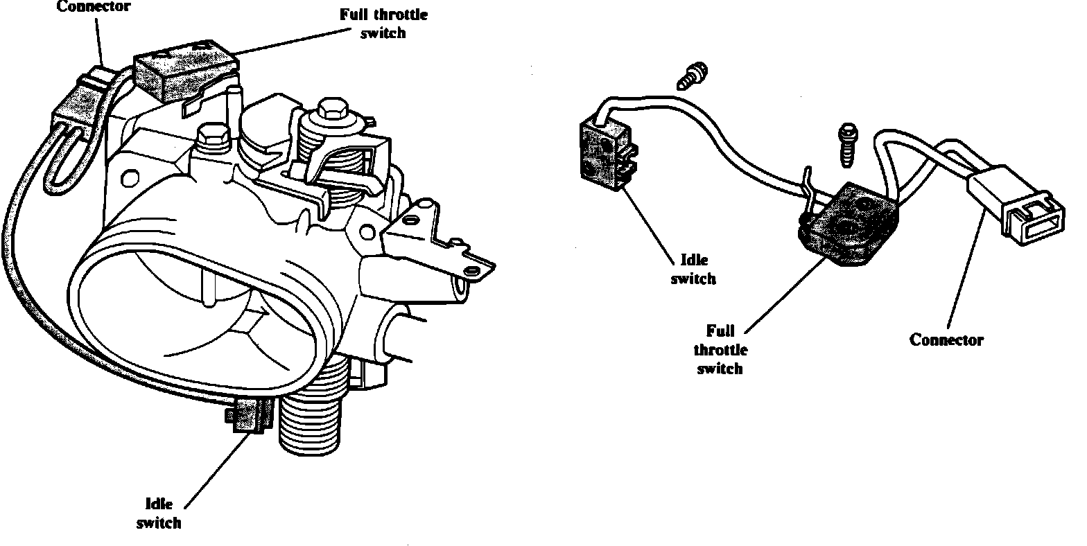 Two switches are used to detect the position of the throttle to determine full load and idle operation. These switches are mounted on the throttle body. The idle switch closes when the throttle is in the idle position, and the full throttle or wide open throttle (WOT) switch closes when the throttle valve is near wide open (within 8~-12~ of the full throttle stop). The signals from these switches help the ECU determine when to engage certain functions, such as idle speed control, deceleration fuel shut-off, full load enrichment and ignition timing controls.