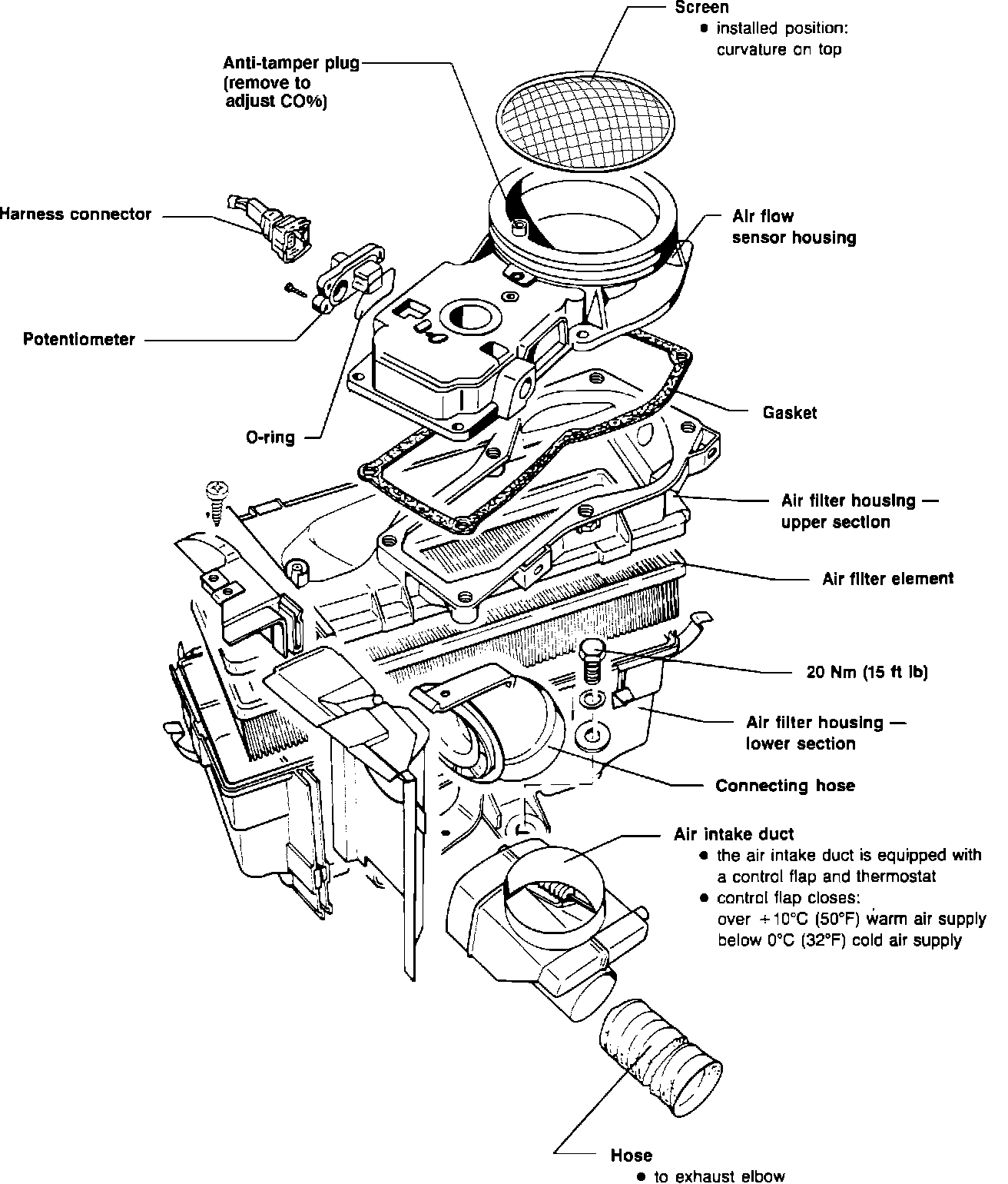 This system, takes hot air from near the exhaust manifold to warm up the intake air during cold weather operation. Warming the intake air produces better fuel atomization and improved driveability during warm-up, and while driving in very cold weather. The thermostat controls intake air temperature, by opening and closing the control flap as needed.