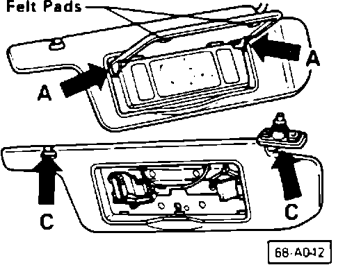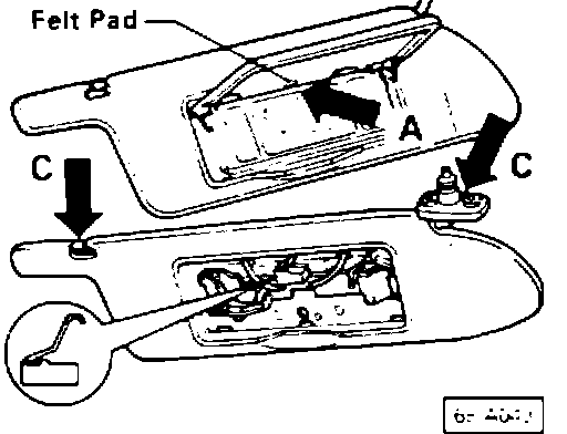 - Using soft cloth to protect sunvisor, pry up at points A with small screwdriver
