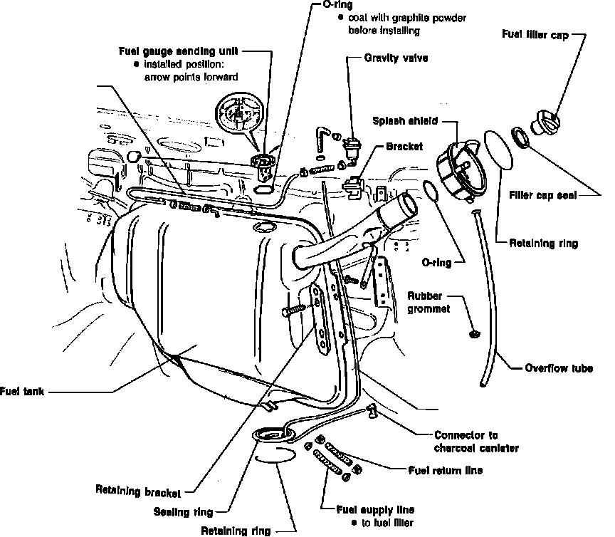 WARNING: FIRE HAZARD! Disconnect battery ground strap when working on the fuel system. Do not smoke or create any sparks where odor of fuel vapor is present.Fuel Tank Assembly:
