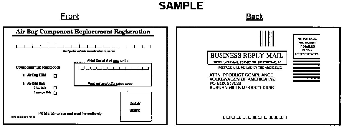 When replacing an air bag sensor module, the postage-paid Air Bag Component Registration card (example below) must always be completed and mailed immediately. For your convenience, a supply of cards have been included with this package. Please clearly print the VIN on the registration card and peel off the lower portion of the label containing the 12-digit (alpha/numeric) serial number from the new air bag sensor module (if provided). Affix the label to or clearly print the serial number in the space provided on the registration card. Mail each card immediately upon completion of the repair.