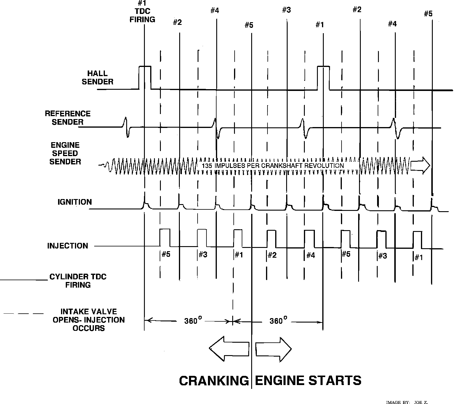 The engine speed sensor signal is also used to calculate the position of the crankshaft at any given time. The flywheel has 135 teeth around its circumference. Each tooth generates a pulse when it passes the speed sensor, representing 2.6° of crankshaft rotation. Once TDC for the #1 cylinder is established (by the crankshaft position reference sensor), the ECU counts the number of flywheel teeth that pass the sensor, and continuously calculates the position of the crankshaft, to determine ignition and injection timing for each cylinder.