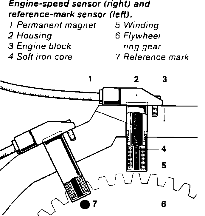 The sensor contains a permanent magnet, and an iron core surrounded by an induction coil. The magnet sets up a magnetic field around the iron core. As the engine turns, the teeth of the flywheel pass in close proximity to the end of the iron core, disturbing the magnetic field. This change in the magnetic field induces a small current in the coil surrounding the iron core, creating a wave-like pulse that the ECU can detect. The frequency of this pulse indicates the speed of the engine. The ECU counts the number of pulses per unit of time and calculates the rpm of the engine. This information is also compared to information from other sensors to determine engine load and establish points on ignition and fuel enrichment "maps" which are permanently stored in the ECU's memory.