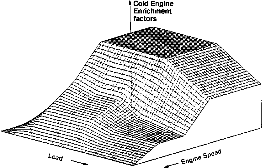 During cold engine operation (coolant temperature less than approx. 150~F/80~C), the ECU will enrich the air/fuel ratio according to a temperature correction factor programmed into the computer memory. The correction factor is different for different engine temperatures (the colder-the richer) and is also dependent on the engine load and speed. At low engine speeds and light loads when the velocity of air through the intake manifold is slow, fuel atomization is poor and a richer mixture is required. As the intake air velocity increases, atomization is improved and a leaner mixture will do. The diagram illustrates one of several pre-programmed enrichment "maps" showing the additional fuel required for different engine speeds and loads at a given engine temperature. Other "maps" determine the "enrichment factor" for other temperature increments. The ECU will switch from one "map" to another, as the engine temperature increases to the normal operating range.