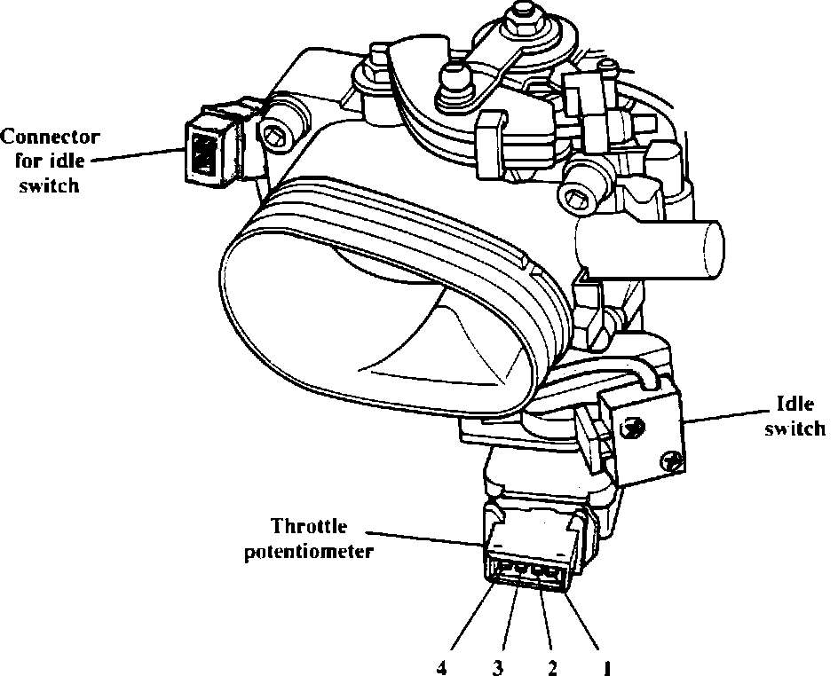 The ECU compares the signal from the idle switch to that of the throttle valve potentiometer and the engine speed sensor, to see if they agree. If the idle switch remains closed during a changing signal from the potentiometer, a fault code will be stored for the idle switch. Also, if the engine speed sensor signal is increasing, indicating "off idle" operation and the idle switch remains closed, or if the idle switch does not close at least once within the first 10 minutes of engine operation, a fault code will be stored for the idle switch.