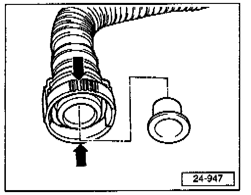 ^ To remove each of the positive crankcase ventilation hoses, press together the oval outer ring at the points indicated (arrows) and disconnect the line.