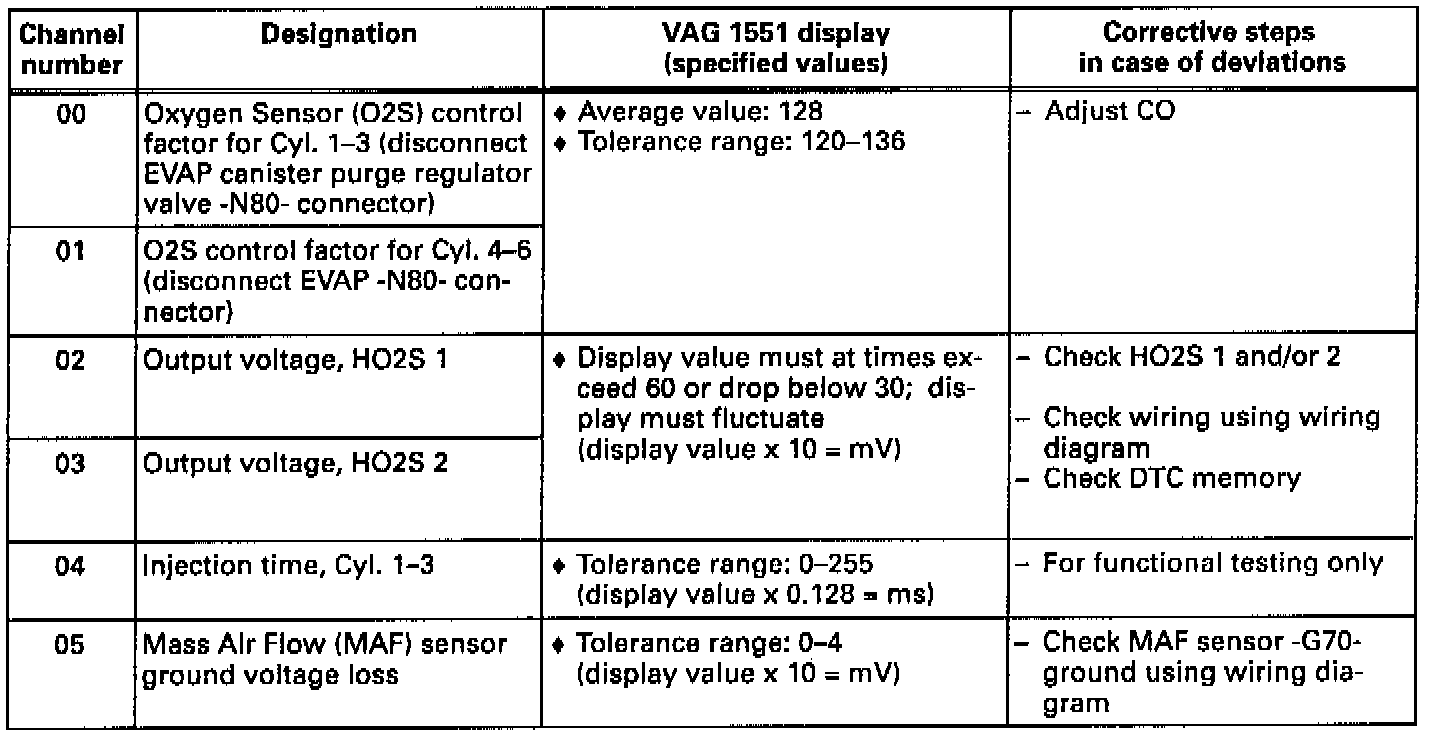 Individual Measuring Values Table - Channels 00 To 05: