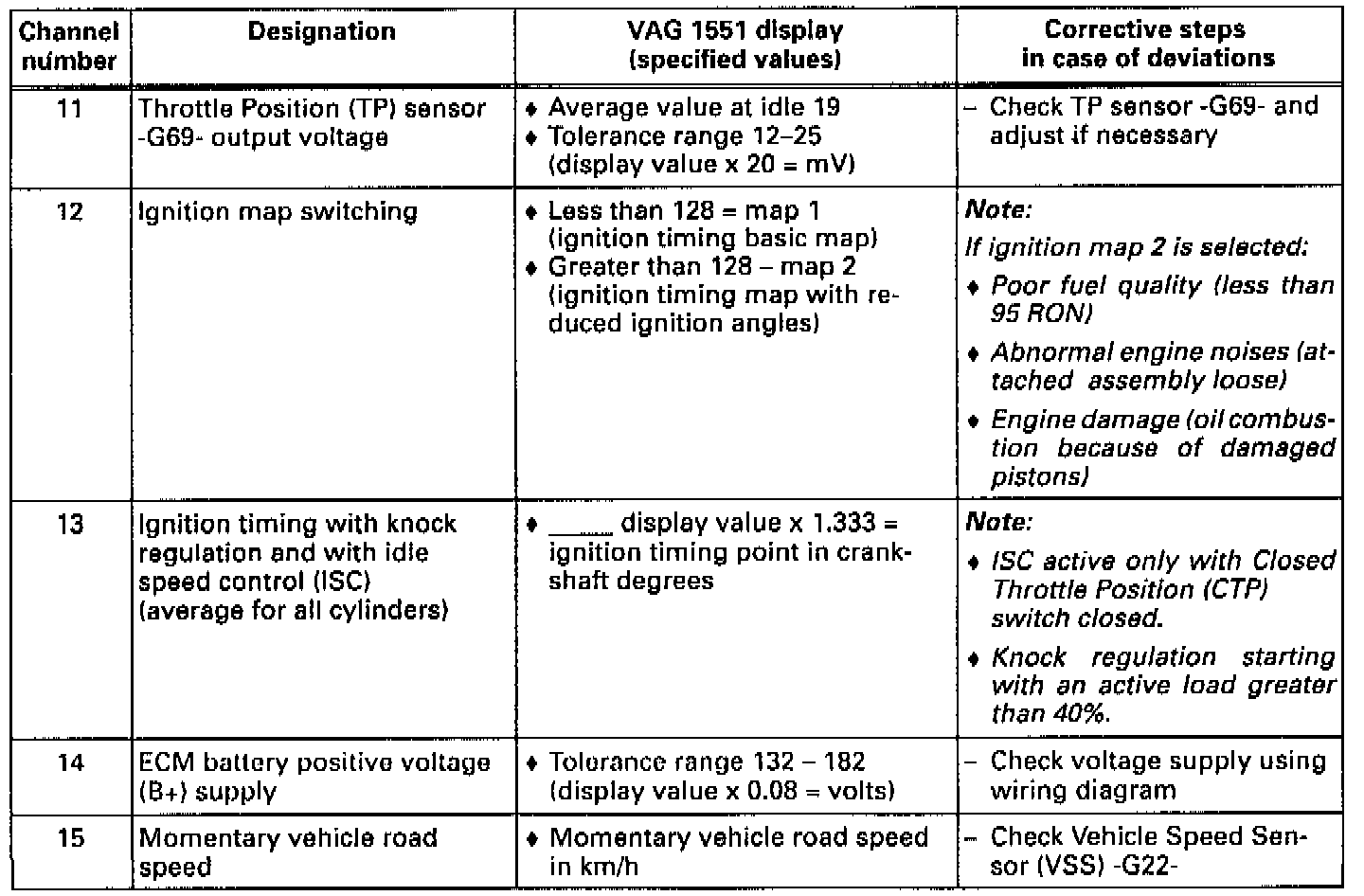 Individual Measuring Values Table - Channels 11 To 15: