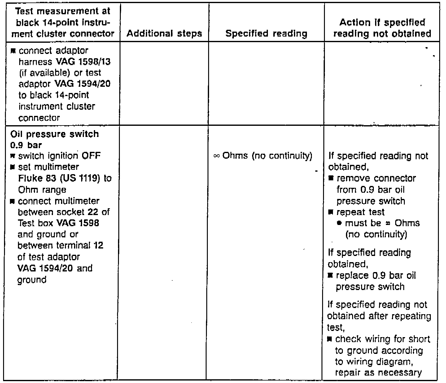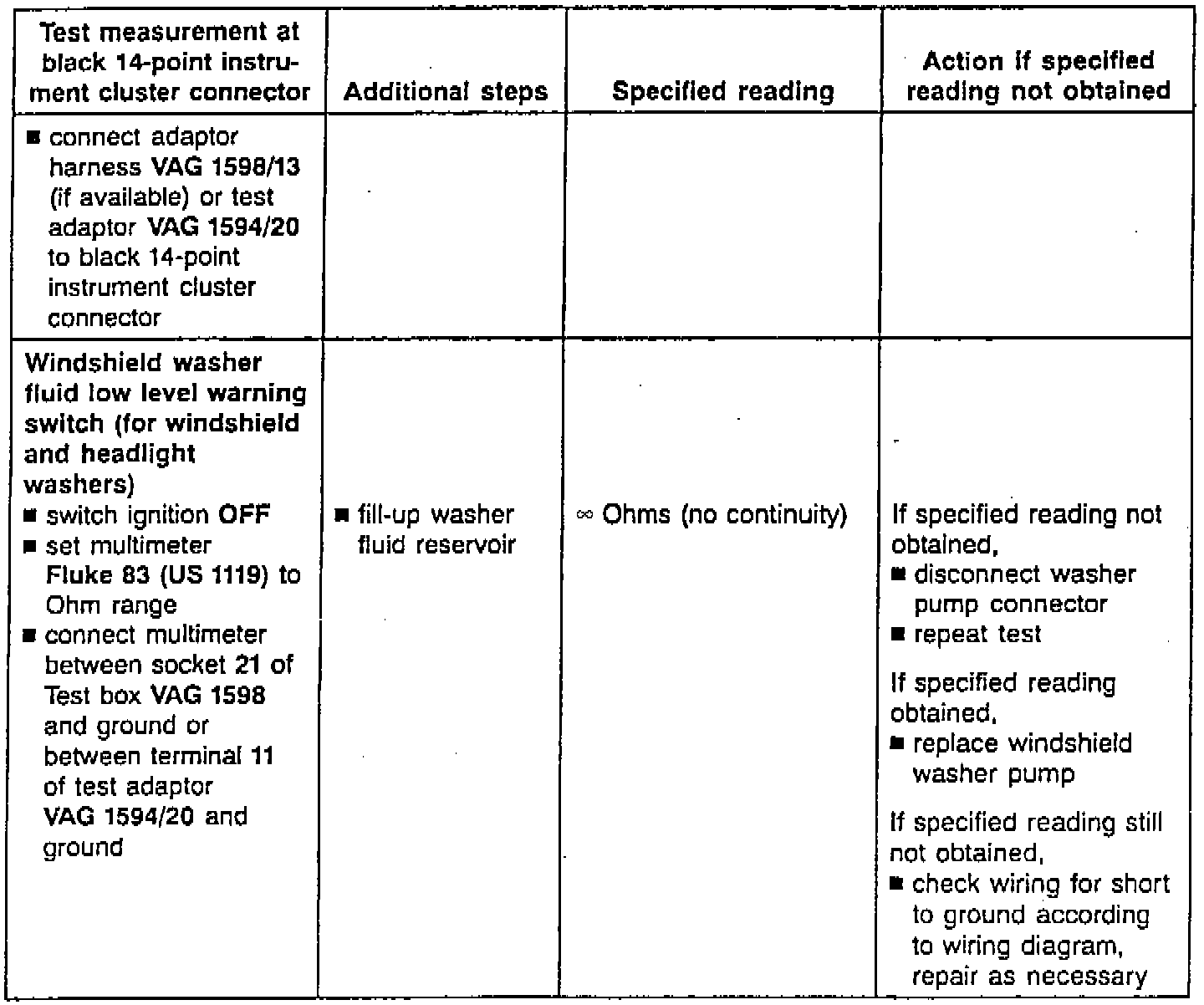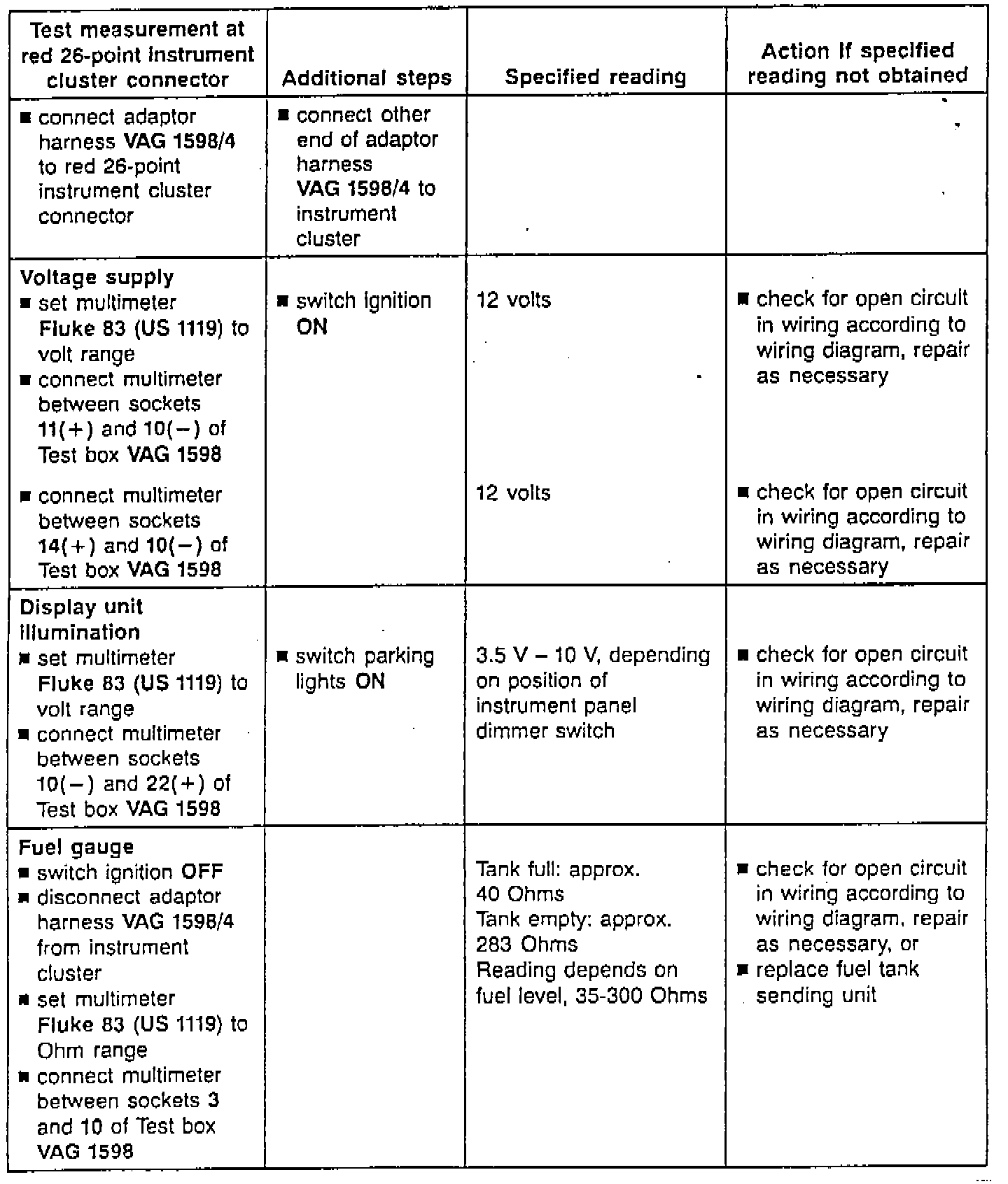 ^ use digital multimeter Fluke 83 (US 1119), connector test kit VW 1594, Test box VAG 1598, adaptor harness VAG 1598/4 and test adaptor VAG 1594/20 when performing electrical checks