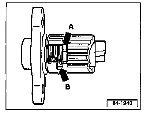 - Lug (arrow -A-) of 5th/Reverse gear locking plunger must always come to rest on side opposite plastic bushing groove (arrow -B-)