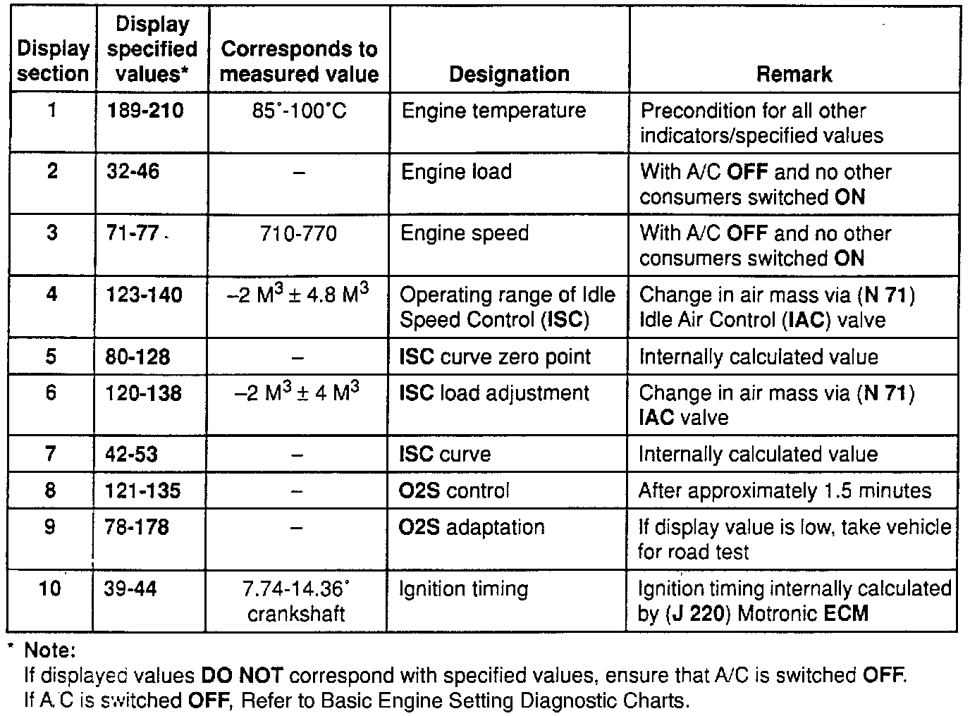 Engine Basic Setting Display Chart: