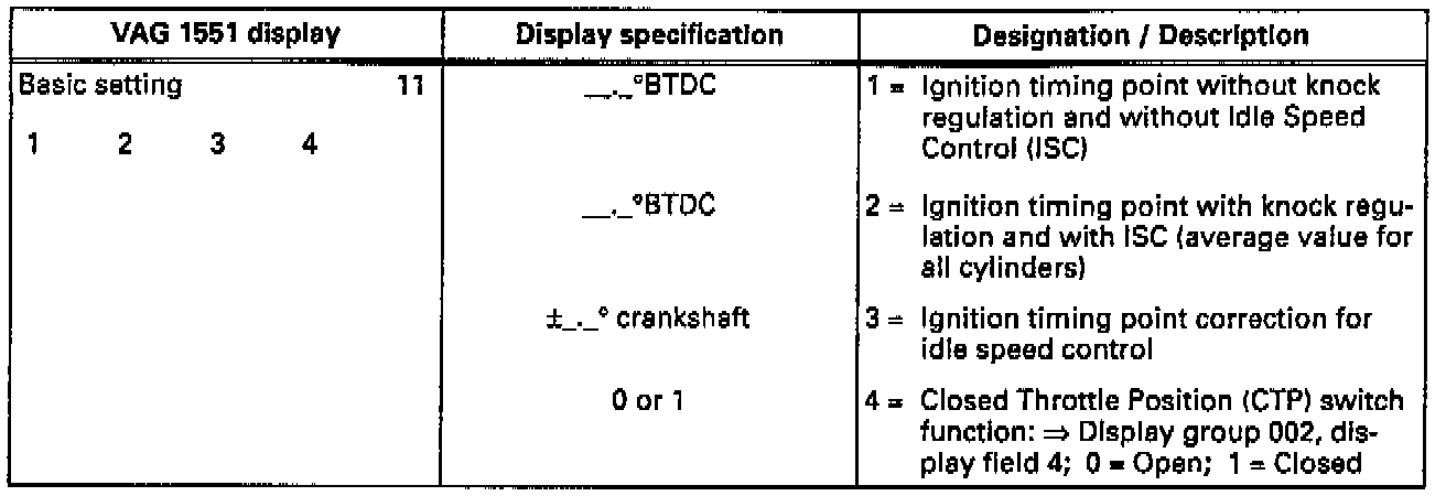 ^ At idle (CTP switch closed), an ignition timing point of 12° BTDC is displayed in "Basic Setting" function 04 and in "Read Measuring Value Block" function 08.