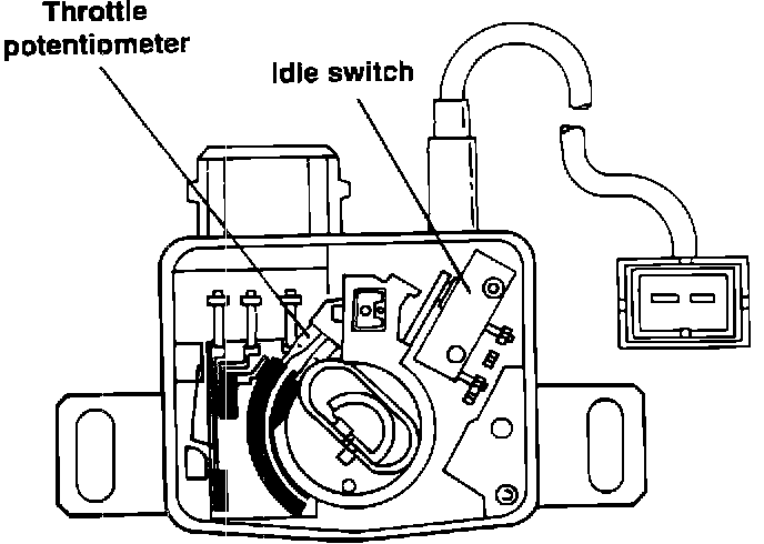 The Throttle Position Sensor and closed throttle position switch are in one housing. The housing is located on the throttle body and operated by the throttle shaft. The Throttle Position Sensor is a potentiometer fitted with two contacts running on two carbon tracks.