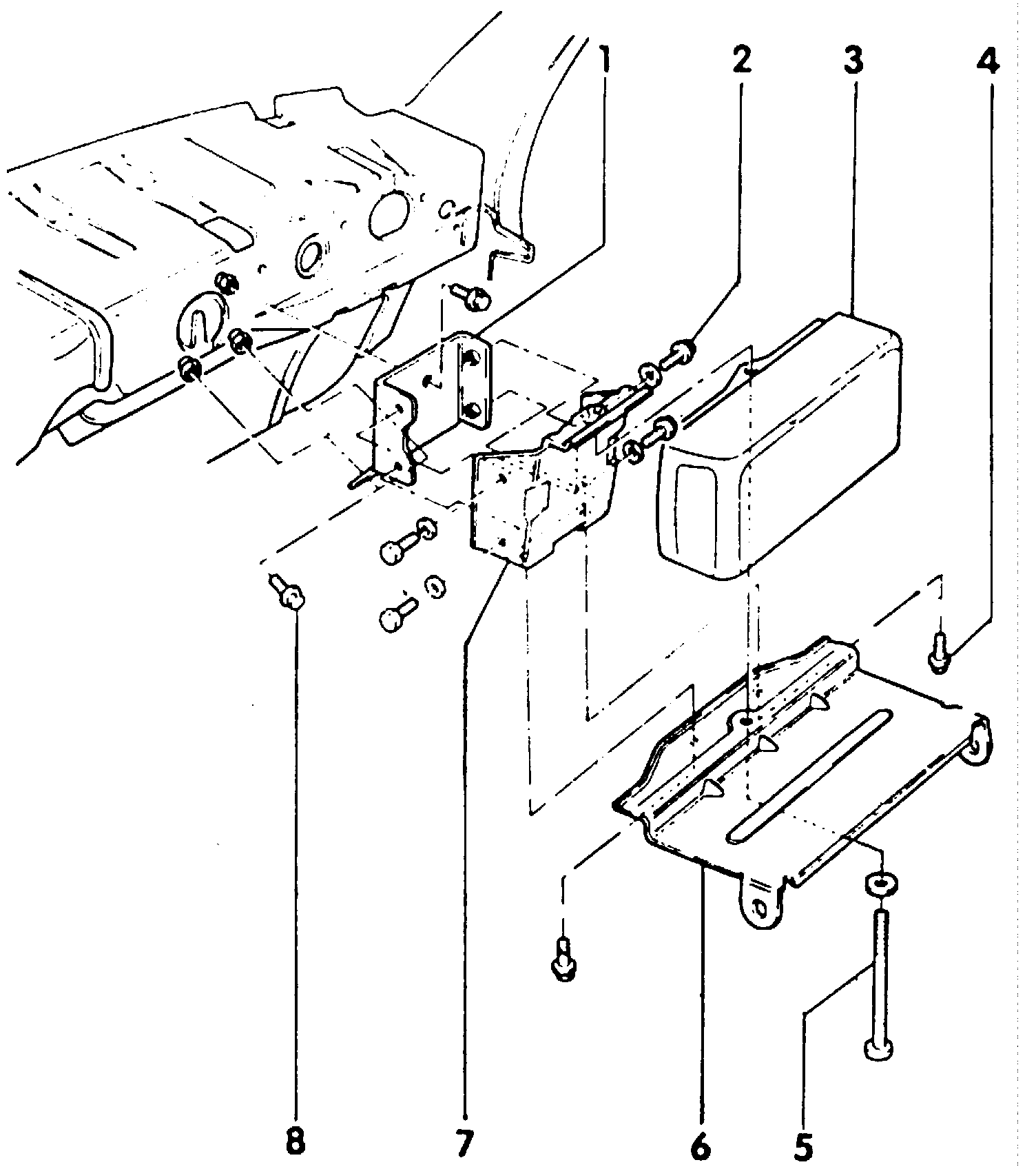 Fig. 7 Passenger's Air Bag Unit (1-Retaining Bracket, 2-Bolts, 3-Passenger Side Air Bag Unit, 4-Bolts, 5-Mounting Bolt, 6-Support Bracket, 7-Mounting Bracket, 8-Bolt).: