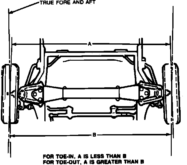 Check toe with the front wheels in the straight ahead position. Lock steering wheel in place and measure distance between extreme front and also between the extreme rear of both front wheels. The difference between these two distances is the toe-in, or toe-out dimensions, Fig. 3.