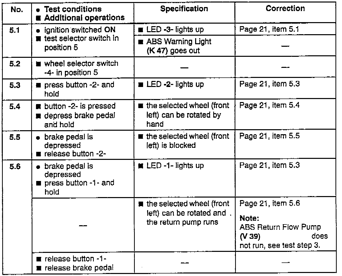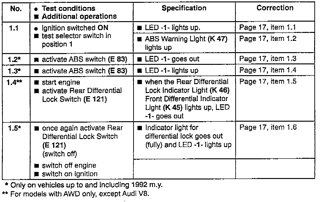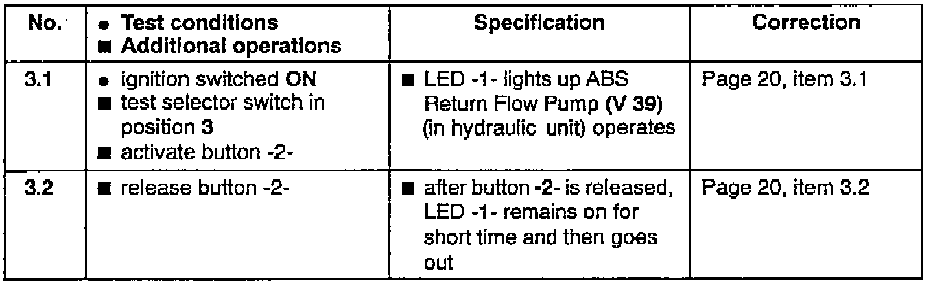 The ABS Warning Light (K 47) lights up in test steps 1 to 4 and 6 when the ignition is switched on. If the LED on the ABS tester (LED -1-) goes out during the ABS test, test power supply to ABS Control Module (J 104)