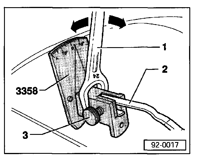 - Apply 24mm wrench -1- to adjustment tool and twist -arrows- wiper arm -2- to obtain specifications according to table below.