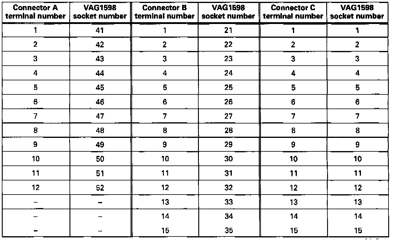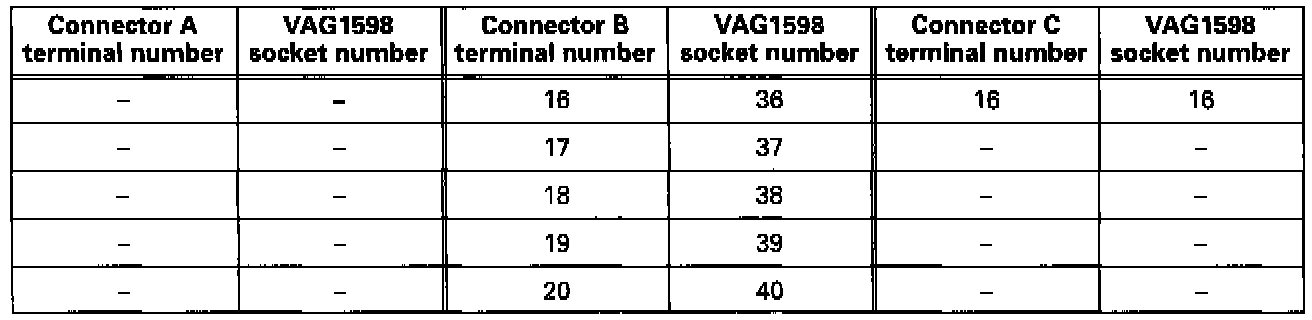 NOTE: These Tables (Images) identify A/C control head terminal numbers and their corresponding VAG1598 test box socket numbers when using the VAG1598/11 adapter.