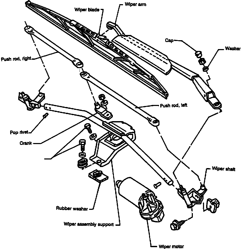 2. Run wipers until left wiper arm is positioned at a 45° angle to the lefthand edge of the windshield, then turn ignition OFF. Wipers must be in this position to facilitate removal of motor and pushrods.