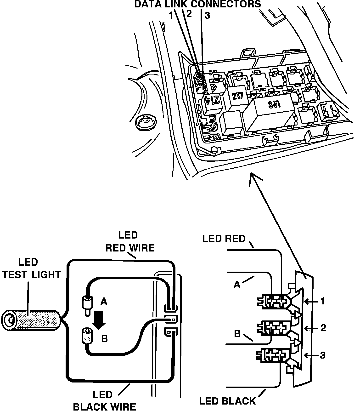 ^ To switch to the next injector without checking, (skip one) connect the jumper wire bridge connectors (A & B) together for at least 4 seconds and then separate, code of component now being activated will display.