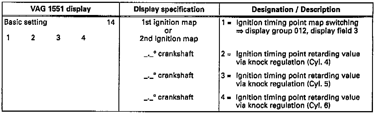 Knock regulation is active at an engine load greater than 40%. If the engine load value exceeds 40%, the current ignition timing retarding values are displayed. When the engine load value drops below 40%, the last ignition timing retarding value used is displayed continuously