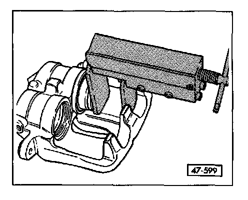 Place wooden board into the recess of the caliper housing to catch the pistons so that they are not damaged. See Fig. 1.