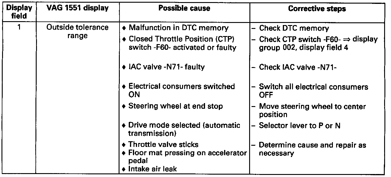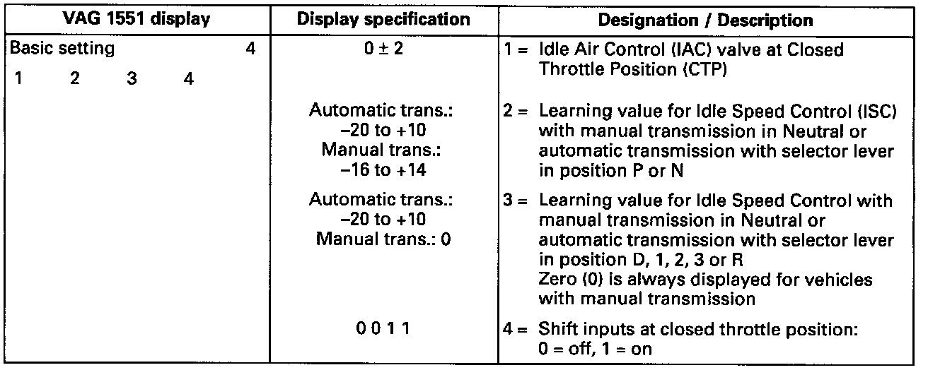 ^ Display values 2 and/or 3 can only be evaluated if the Idle Air Control (IAC) valve lies within tolerance range in closed throttle position (display value 1). If the IAC valve does not lie within tolerance range after 1 minute waiting time, no learning takes place in display fields 2 and/or 3.