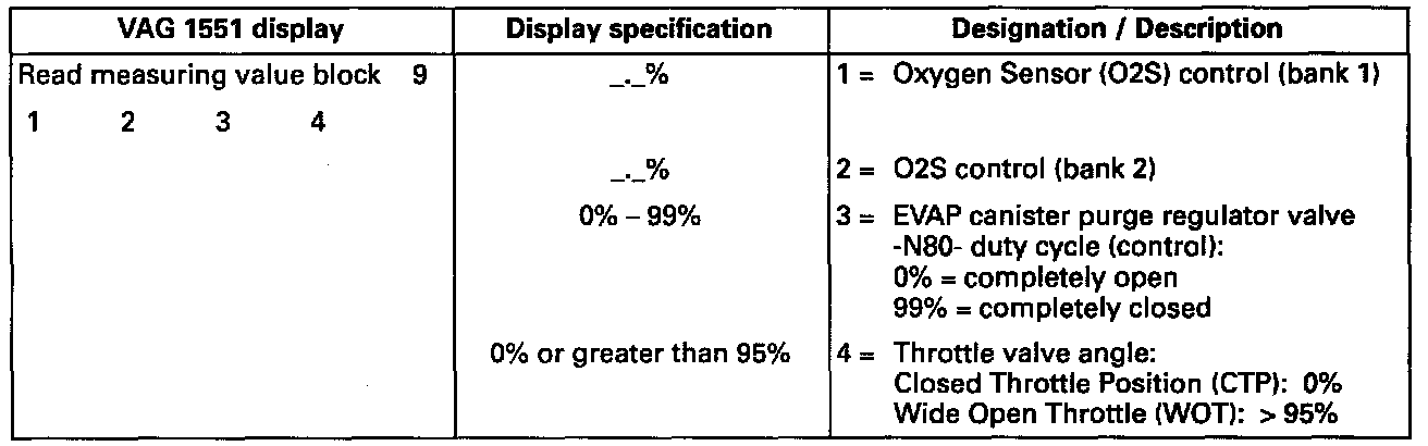 ^ The EVAP canister influence can be evaluated by comparison of the display value during "Basic Setting" function 04 (EVAP canister purge regulator valve completely closed = 99%) and during "Read Measuring Value Block" (EVAP canister purge regulator valve completely open 0%).