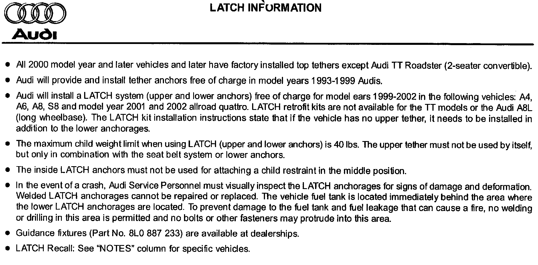 ^ Whenever a lower anchor retrofit is installed, the tether anchor MUST also be installed, if not already present in the vehicle.