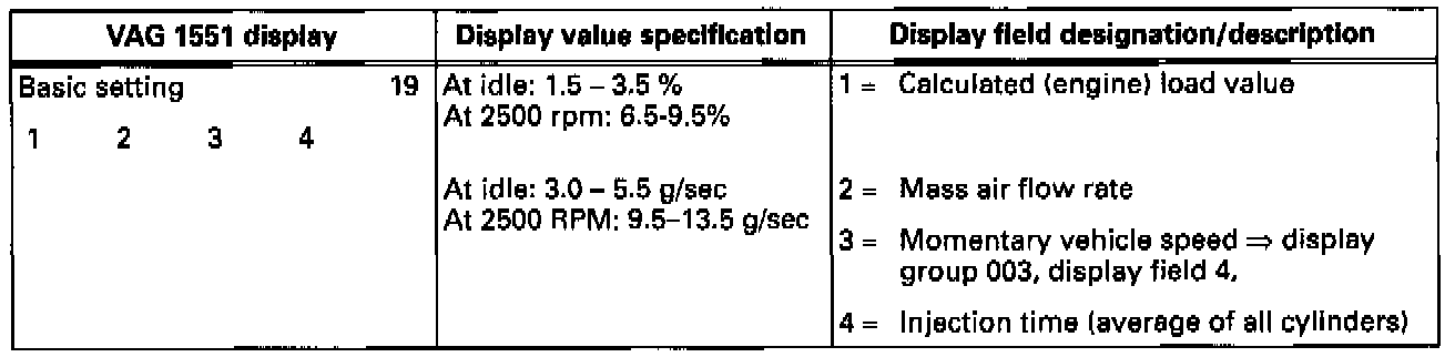 NOTE FOR DISPLAY GROUP 019:OBD II regulations require a normal range for "Calculated load value" and "Mass air flow rate "at idle and at 2500 RPM to be listed. Normal range values are included in the table below.