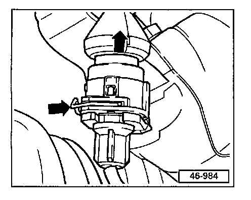 Disconnect harness connector by pressing spring (bottom arrow).