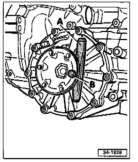 - Pull flanged shaft out of differential bevel gears by turning bolt -B-.