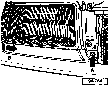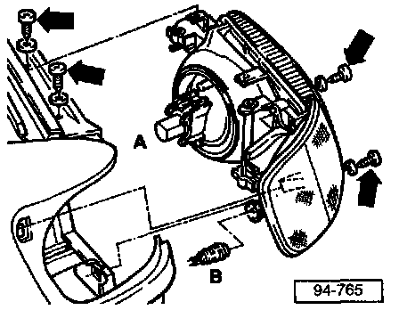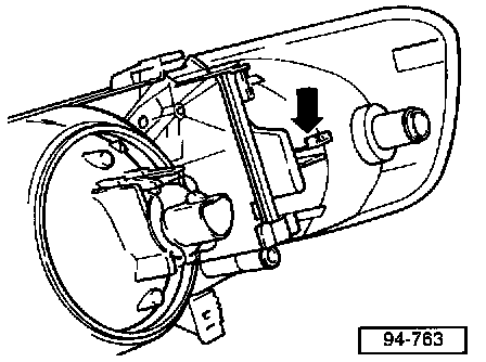 - Press clip (arrow) and slide turn signal/parking light assembly forward from headlight housing.