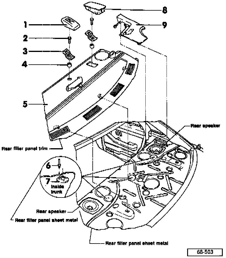 - From inside trunk locate anchorage points for washer 7, pop-rivets 6 in rear filler panel sheet metal.