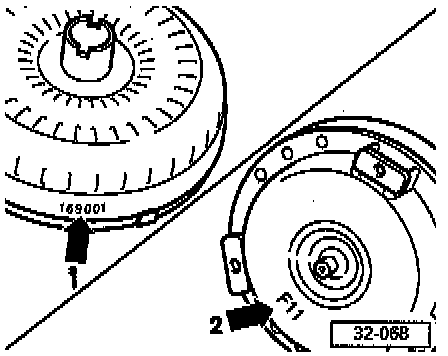IDENTIFICATIONThere are different torque converters. The identification is marked on the circumference (arrow -1-) and on the side facing the engine (arrow -2-).