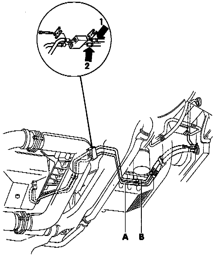 - Install a length of hose onto line A, at location shown (arrow-2-)