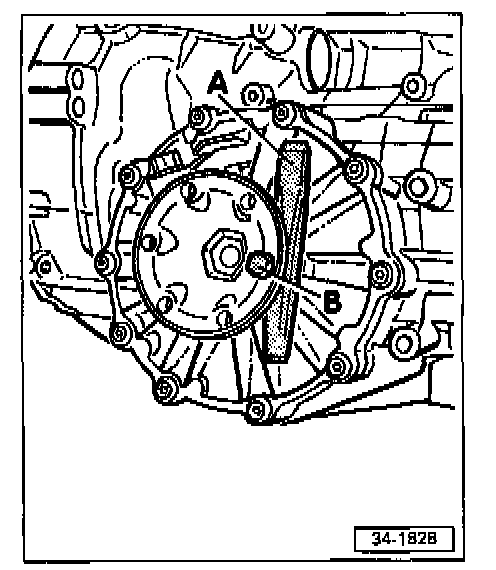 - Pull drive flange shaft out of differential gears by turning bolt -B-.