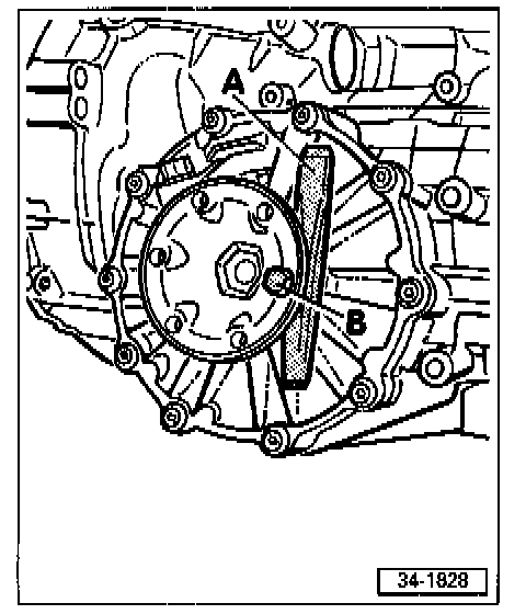 - Pull drive flange shaft out of differential gears by turning bolt -B-.