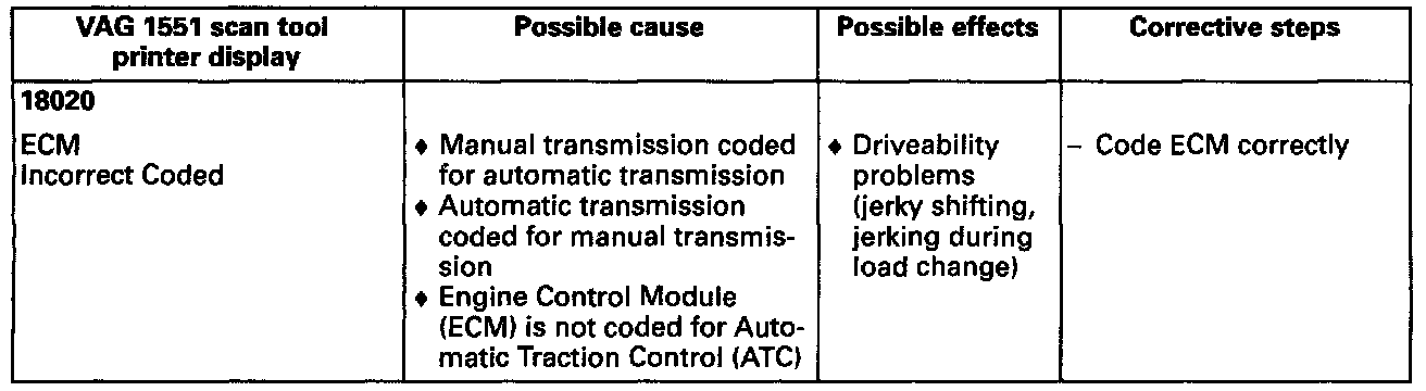 ^ DTC "18020" (ECM -J192- not coded for automatic traction control) is set as soon as a signal is received from the ABS/ATC control module and the ECM -J192- is not coded for ATC.